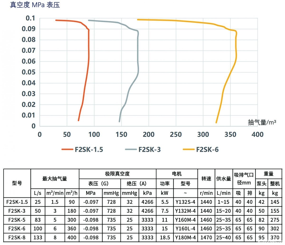F2SK系列与FSK系列设计类似,同样采用了径向叶轮,它特点是增加了一个副叶轮,可以将真空度由-0.093提升到-0.098MPa。
